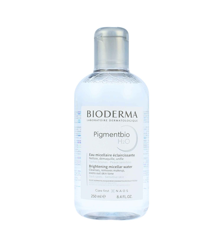 Micelární voda speciálně vyvinuta pro pokožku s poruchami pigmentace Bioderma Pigmentbio H2O jemně čistí a odličuje obličej a oční okolí. Patentovaná kombinace aktivních složek reguluje biologické mechanismy a zabezpečuje zesvětlení pokožky. Velmi dobrá snášenlivost pokožky tváře a očního okolí. Bez parfemace.