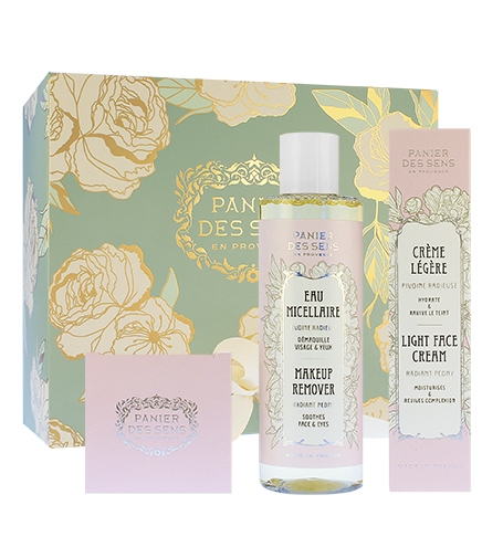 Sada produktů pro hydratační a rozjasňující rituál: čištění, hydratace a posílení jasu pleti. Přírodní péče s extraktem z pivoňky pěstované a sklizené ve Francii.