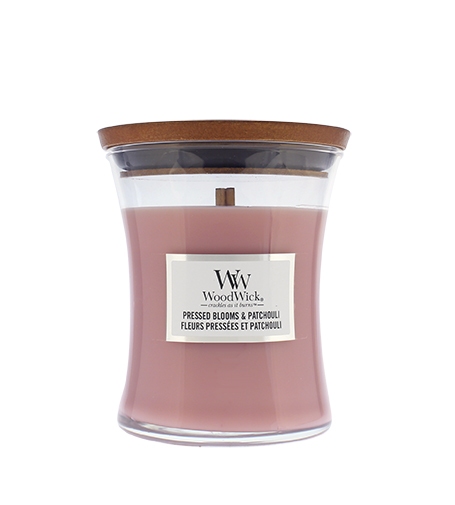 WoodWick Pressed Blooms & Patchouli vonná svíčka s dřevěným knotem 275 g